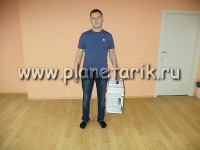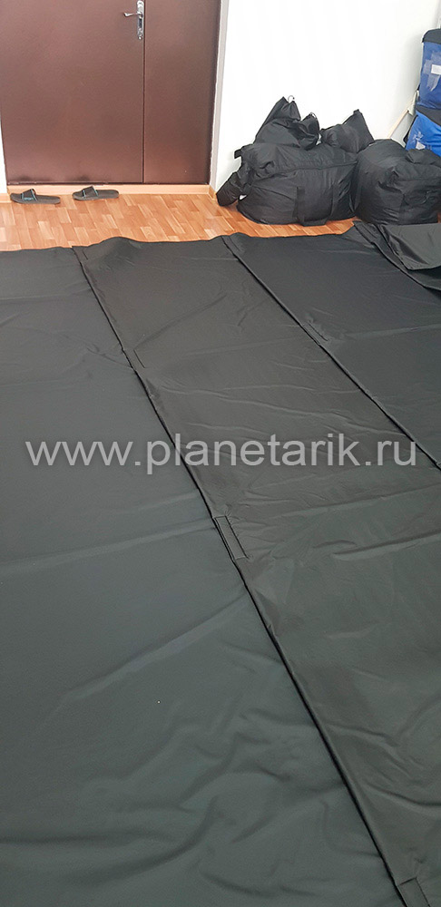 Учитывая эти особенности, мы разработали специальные портативные маты для мобильного планетария. Это 5 полос шириной 1 метр и длиной 5 метров, которые ложатся немного в нахлест друг на друга, скрепляясь между собой липучками и соответственно не разъезжаются при движении зрителей. Маты образуют единую площадку без щелей площадью 5*5 метров.