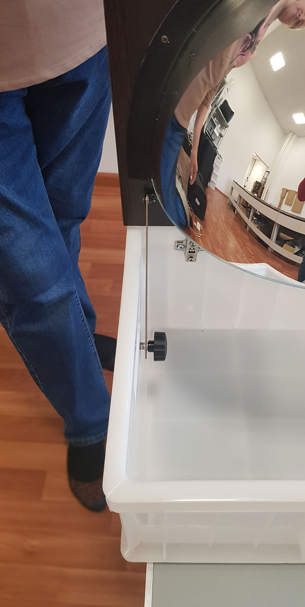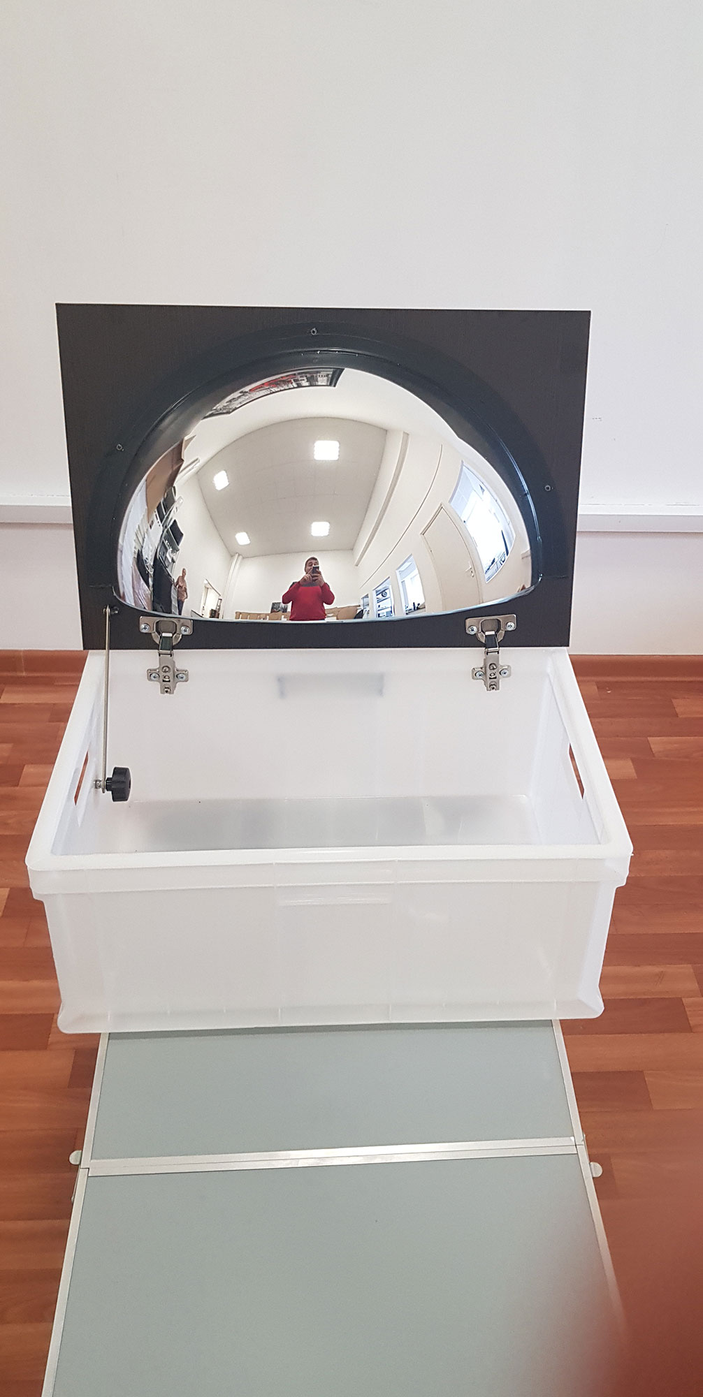 Зеркало вмонтировано в пластиковый короб, который служит для защиты зеркала от повреждения. У короба есть ручки для транспортировки.