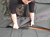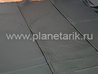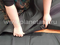 Учитывая эти особенности, мы разработали специальные портативные маты для мобильного планетария. Это 5 полос шириной 1 метр и длиной 5 метров, которые ложатся немного в нахлест друг на друга, скрепляясь между собой липучками и соответственно не разъезжаются при движении зрителей. Маты образуют единую площадку без щелей площадью 5*5 метров.